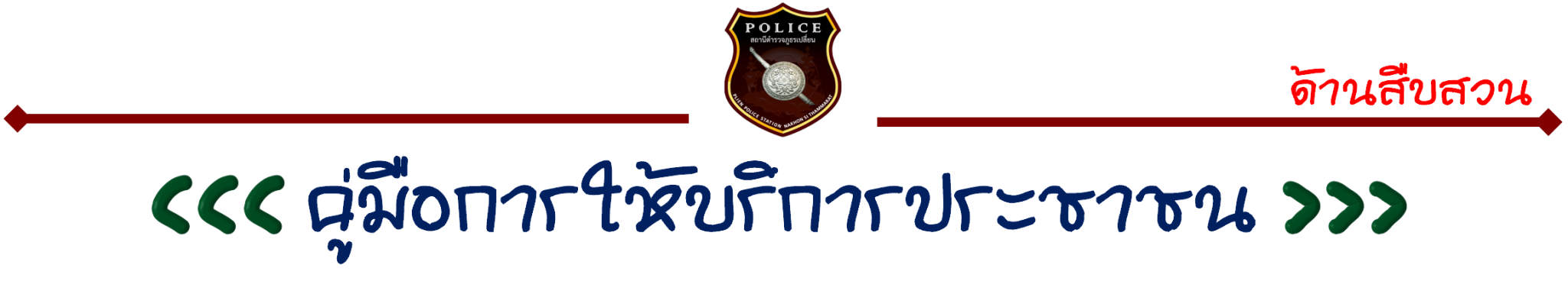 <<< คู่มือการให้บริการประชาชน จัดทำในรูปแบบไฟล์ PDF เพียงแค่กดปุ่ม Click Here หากมีคู่มือฉบับปัจจุบัน (Update) สถานีตำรวจภูธรเปลี่ยน จะดำเนินการเผยแพร่เพิ่มเติมให้อย่างรวดเร็วที่สุด >>>
