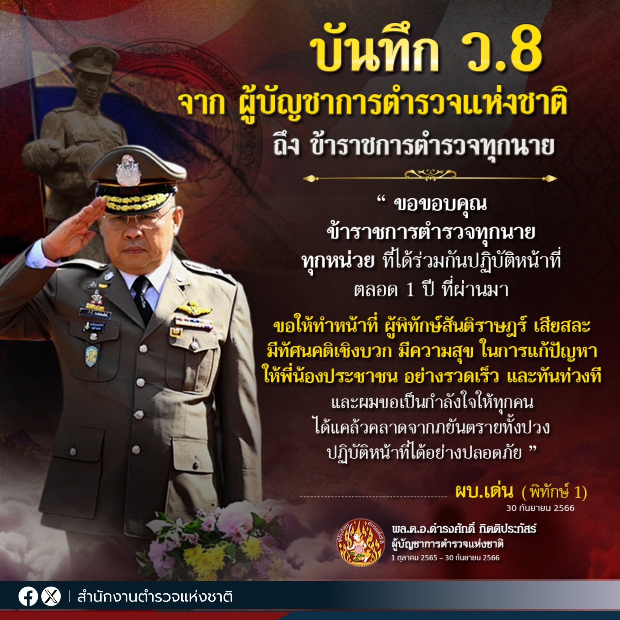ผมขอขอบคุณข้าราชการตำรวจทุกนาย ที่ได้ร่วมกันปฏิบัติหน้าที่อย่างเต็มที่ มาตลอดระยะเวลา 1 ปี ในการดูแลความสงบสุขให้แก่สังคม พี่น้องประชาชน ร่วมกันทำหน้าที่ในฐานะ “ผู้พิทักษ์สันติราษฎร์” ได้อย่างสมเกียรติ สมศักดิ์ศรี