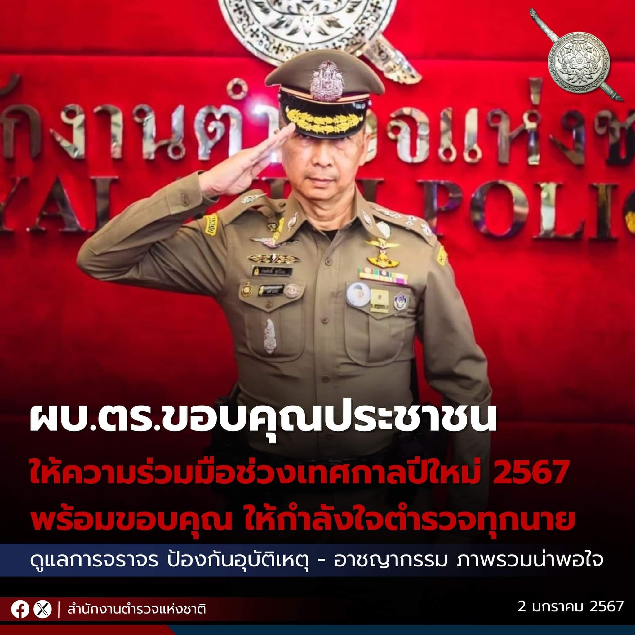 ผบ.ตร.ขอบคุณประชาชนให้ความร่วมมือปีใหม่ พร้อมขอบคุณ ให้กำลังใจตำรวจทุกนายที่ดูแลการจราจร ป้องกันอุบัติเหตุ และอาชญากรรม ภาพรวมเป็นที่น่าพอใจ แต่ย้ำคุมเข้มขับรถเร็ว เมาแล้วขับ สาเหตุหลักอุบัติเหตุ