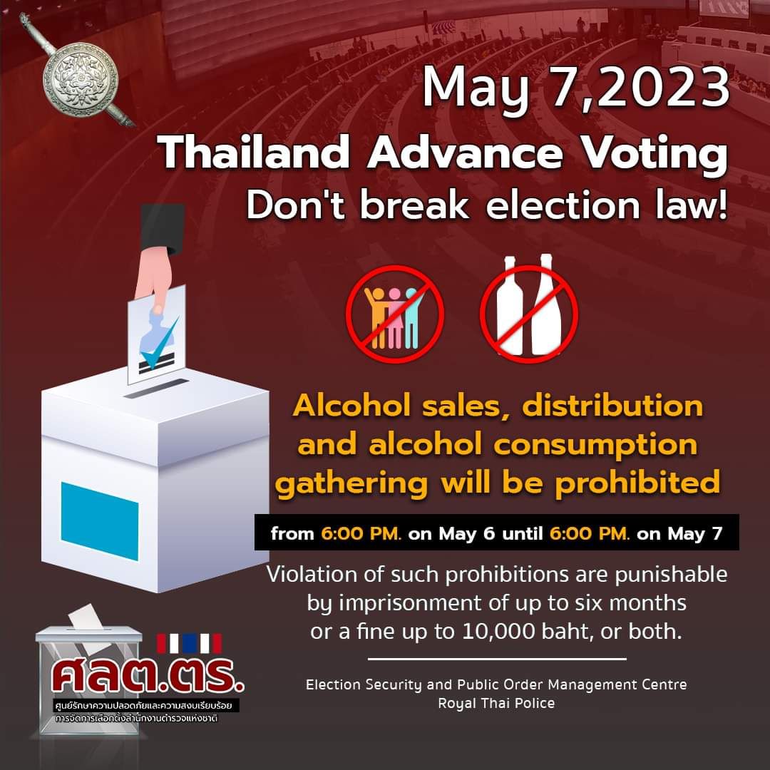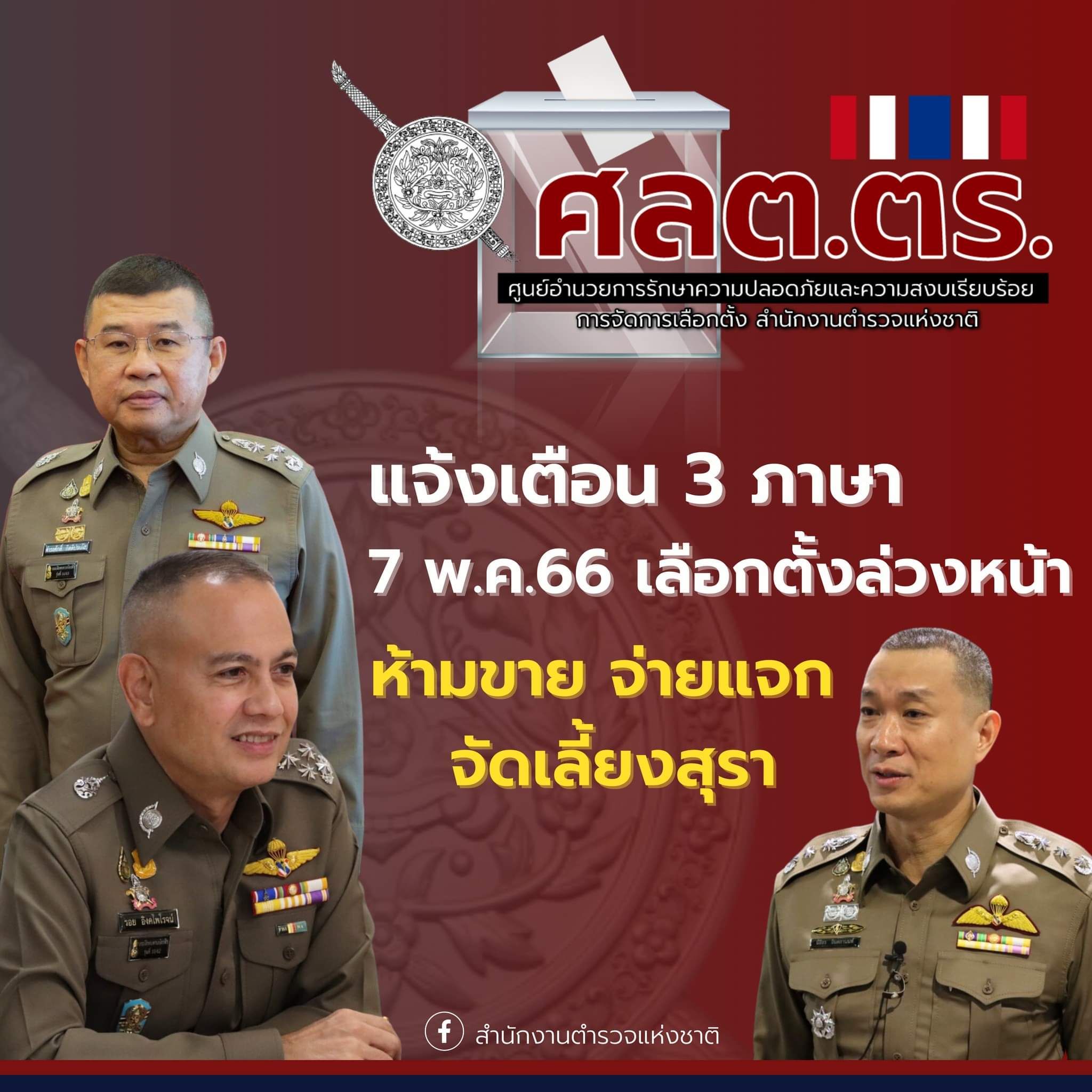 ศลต.ตร.แจ้งเตือน 3 ภาษา 7 พ.ค.นี้ เลือกตั้ง ส.ส.ล่วงหน้า ห้ามจำหน่าย จ่ายแจก จัดเลี้ยงสุรา ทั่วประเทศ!