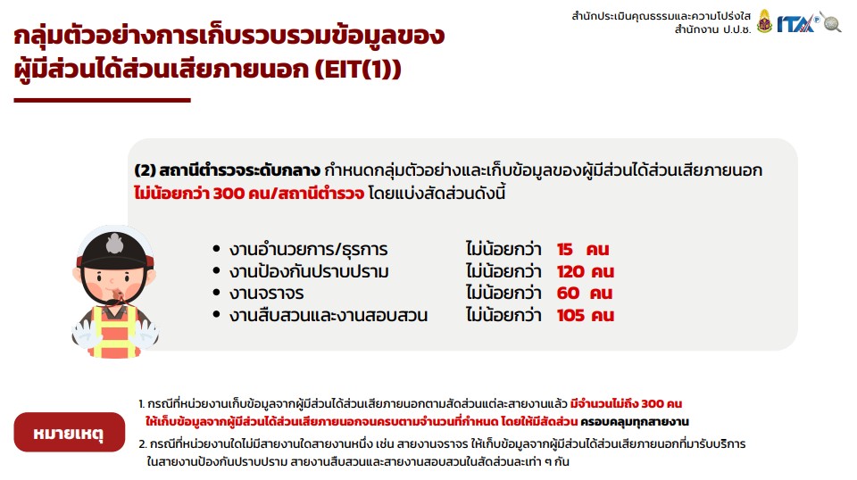 – ให้แต่ละแผนกงานจัดทำป้ายประชาสัมพันธ์ QR Code หรือ URL ช่องทางการเข้าตอบแบบวัดการรับรู้ของผู้มีส่วนได้ส่วนเสียภายนอก (External Integrity and Transparency Assessment: EIT) Website และ Facebook ของสถานีตำรวจ