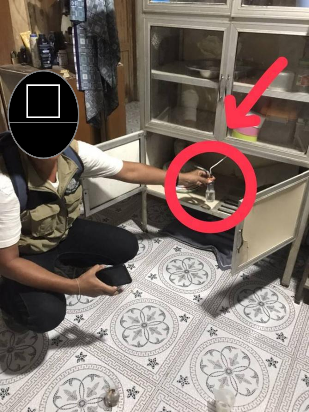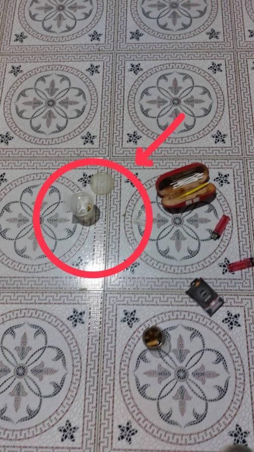 - อุปกรณ์การเสพยาเสพติด จำนวน 1 ชุด พบ อยู่ในตู้กับข้าวชั้นล่าง ในห้องครัวบ้านที่เกิดเหตุ