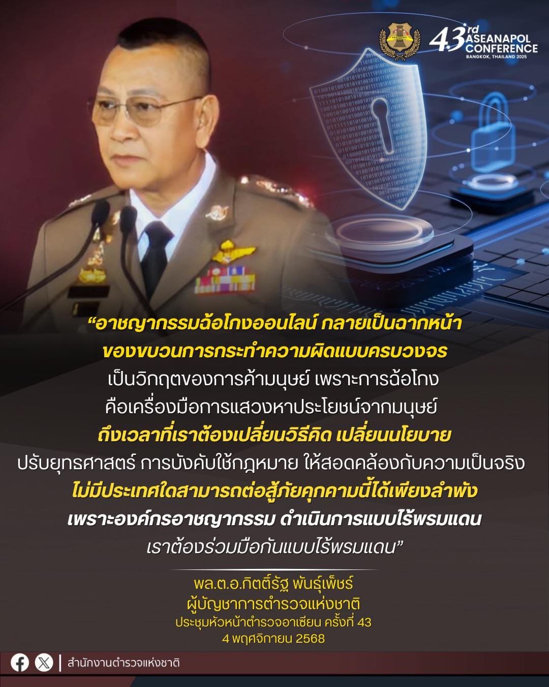 āļžāļĨ.āļ•.āļ­.āļāļīāļ•āļ•āļīāđŒāļĢāļąāļ āļžāļąāļ™āļ˜āļļāđŒāđ€āļžāđ‡āļŠāļĢāđŒ āļœāļđāđ‰āļšāļąāļāļŠāļēāļāļēāļĢāļ•āļģāļĢāļ§āļˆāđāļŦāđˆāļ‡āļŠāļēāļ•āļī āļāļĨāđˆāļēāļ§āđƒāļ™āļāļēāļĢāđ€āļ›āļīāļ”āļ‡āļēāļ™āļ›āļĢāļ°āļŠāļļāļĄāļŦāļąāļ§āļŦāļ™āđ‰āļēāļ•āļģāļĢāļ§āļˆāļ­āļēāđ€āļ‹āļĩāļĒāļ™ āļ„āļĢāļąāđ‰āļ‡āļ—āļĩāđˆ 43 ( 4 āļžāļĪāļĻāļˆāļīāļāļēāļĒāļ™ 2568 )