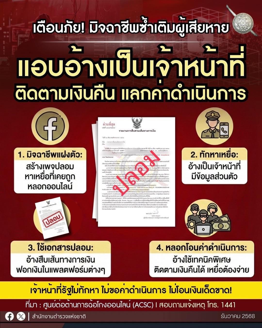 อย่าหลงกล อุบายมิจจี้สำนักงานตำรวจแห่งชาติเตือนภัย มิจฯหลอกลวงซ้ำเติมผู้เสียหาย แอบอ้างเป็นเจ้าหน้าที่ติดตามเงินคืนแลกค่าดำเนินการ แฝงตัวในโซเชียลมีเดียสร้างเพจ Facebook ปลอม มักใช้รูปเจ้าหน้าที่รัฐ โลโก้หน่วยงานรัฐ ทำให้ดูคล้ายเป็นเพจหน่วยงานราชการ หาเหยื่อที่โดนหลอกออนไลน์ ทักหาเหยื่อ อ้างเป็นเจ้าหน้าที่ มีข้อมูลส่วนตัว โชว์เอกสารราชการที่ทำปลอมขึ้นมา อ้างสืบสวนเส้นทางการเงิน แล้วพบว่าพฤติการณ์ฟอกเงิน เพื่อเร่งเร้าให้เหยื่อตกหลุมพราง  รับอาสาดำเนินการช่วยเหลือติดตามเงินคืนโดยใช้เทคนิคพิเศษแต่เหยื่อต้องจ่ายค่าดำเนินการพฤติกรรมแบบนี้มิจฉาชีพแน่นอน #ไม่เชื่อไม่รีบไม่โอน#เตือนภัยออนไลน์#ศูนย์ต่อต้านการฉ้อโกงออนไลน์