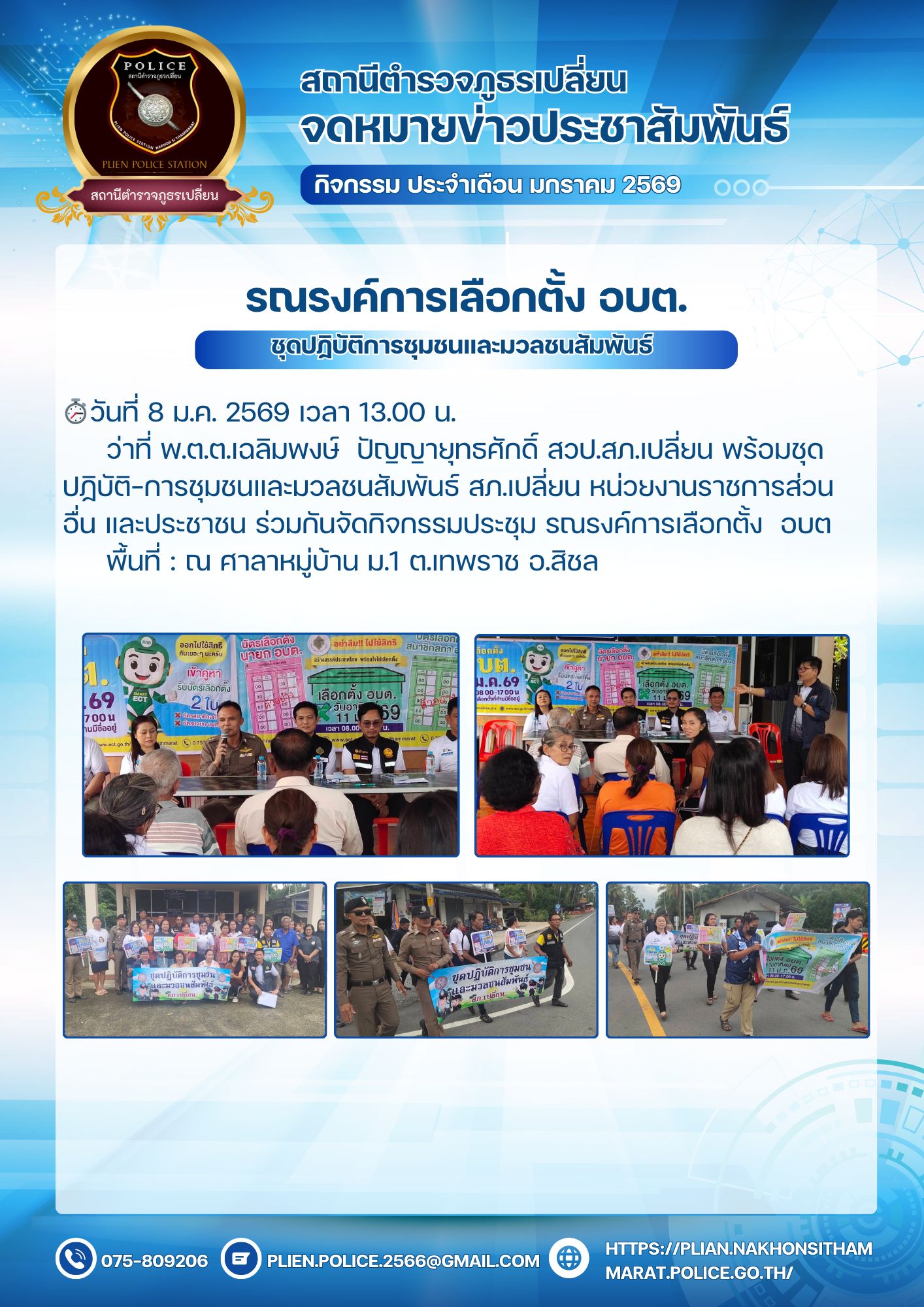 สถานีตำรวจภูธรเปลี่ยน วันนี้ ( 8 มกราคม 2569 ) เวลา 13.00 น. เป็นต้นไป สถานีตำรวจภูธรเปลี่ยน โดย พ.ต.ต.เฉลิมพงษ์ ปัญญายุทธศักดิ์ สวป.สภ.เปลี่ยน พร้อมชุดชมส. หน่วยงานส่วนอื่นและประชาชน ร่วมประชุม รณรงค์การเลือกตั้ง อบต. ผลการปฏิบัติ : การปฏิบัติเป็นไปด้วยความเรียบร้อย ปัญหา/อุปสรรค : ไม่มี สถานที่ : ศาลาหมู่บ้าน หมู่ที่ 1 ต.เทพราช อ.สิชล จ.นครศรีธรรมราช#สถานีตำรวจภูธรเปลี่ยน#ตำบลเปลี่ยน#ตำบลเทพราช#ไสเหรียง#สิชล