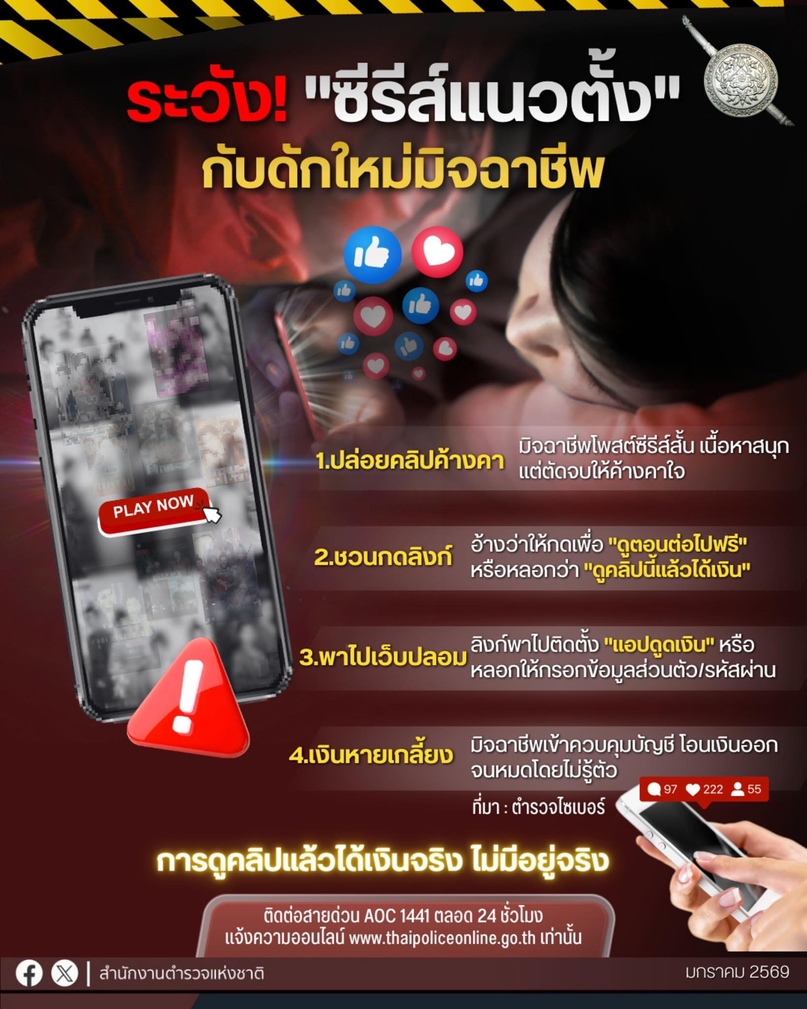 คุณกำลังดูซีรีส์แนวตั้งอยู่หรือเปล่า ระวัง ติดกับดัก มิจจี้แฝงตัวปล่อยคลิปค้างคาชวนกดลิงก์ดูต่อฟรี / ดูแล้วได้ตังพาไปเว็บปลอม พาไปโหลดแอปดูดเงิน กรอกข้อมูล รหัสผ่านเงินหายเกลี้ยงอย่าหลงกล ดูคลิปแล้วได้เงินไม่มีจริง #เตือนภัยออนไลน์